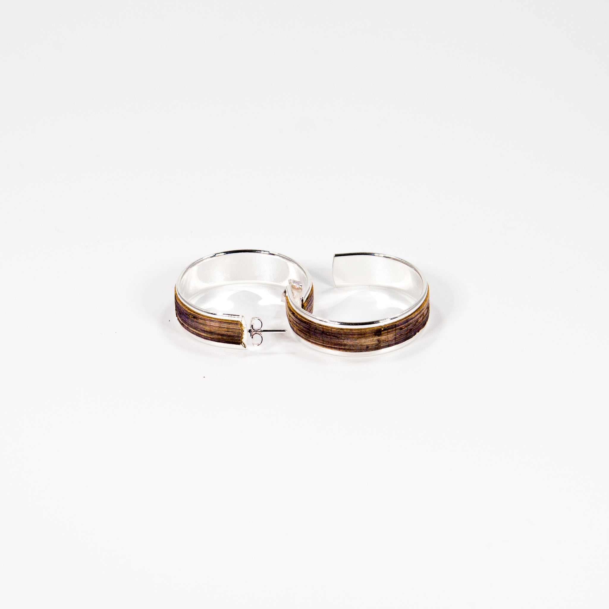 Boucle d'Oreilles en laiton argent, en liège sérigraphié rayé beige et mauve, réglable.